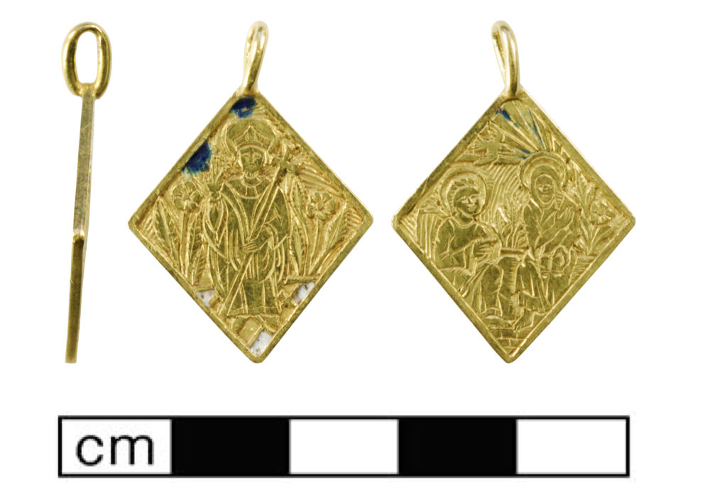 This tiny (2cm), but beautiful gold pendant has Christian religious images on both sides and dates to around 1450-1500. The very detailed carving shows St Thomas Beckett on one side, and The Annunciation on the other (where the angel Gabriel kneels before the Virgin Mary). In Medieval times, faith was central to most aspects of life, and wearing religious jewellery was one way a person could show their devotion. The background of the pendant was originally very colourful with blue and white enamel, but only traces of it remain.